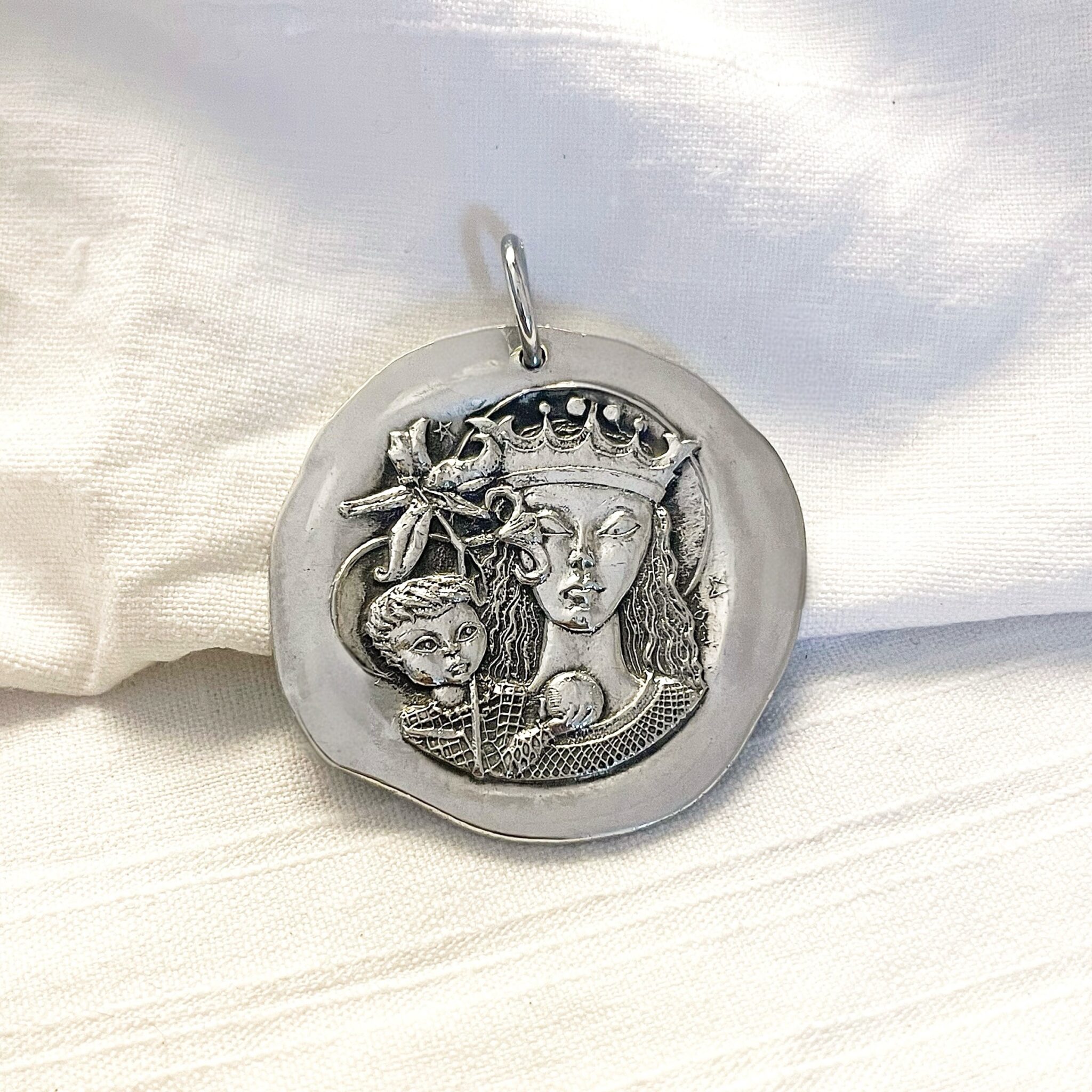 La médaille représente la Vierge en majesté, couronnée et auréolée. L’Enfant Jésus tient dans sa main, une boule symbolisant le monde.
